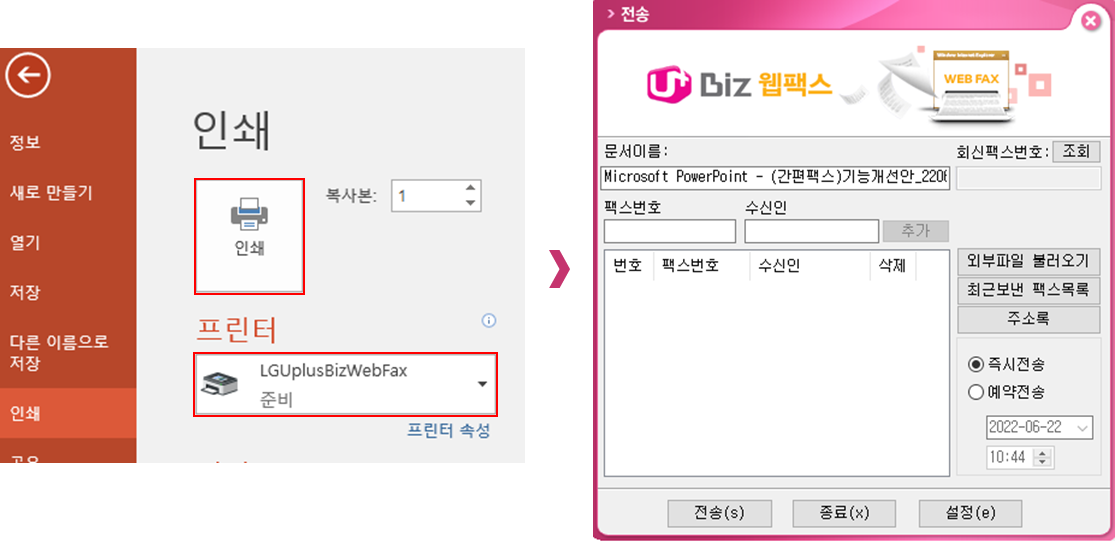 인쇄 버튼으로 팩스를 간편하고 빠르게 발송할 수 있습니다.