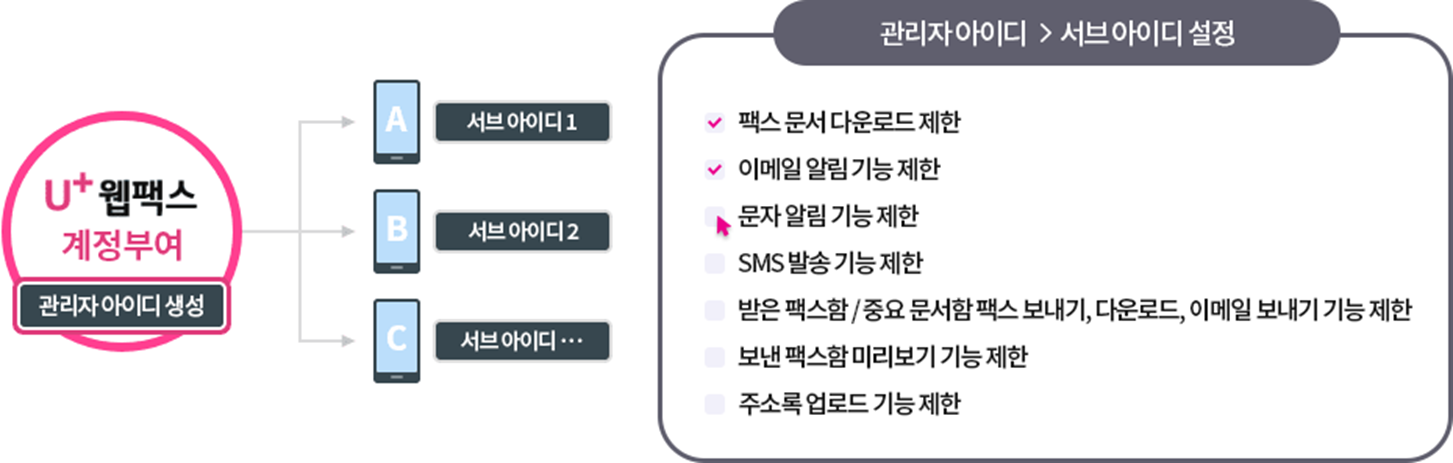 그리고 U+웹팩스 서비스에서는 서브 아이디 관리 부가 기능을 사용할 수 있습니다.