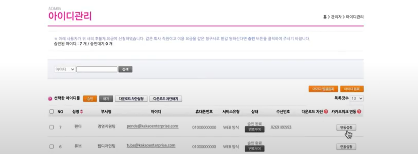 👇다시 관리자 메뉴로 돌아가서 "카카오워크 연동" 메뉴를 클릭해주세요!👇
