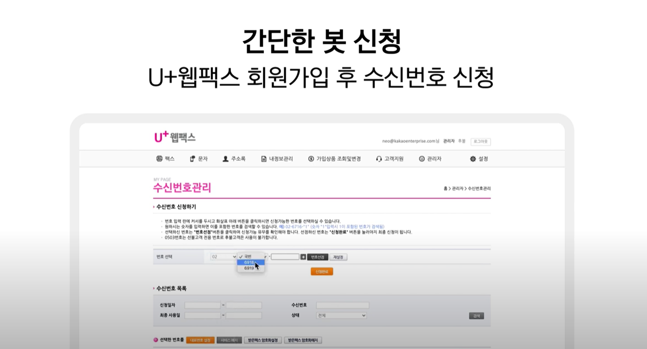 👍U+비즈마켓에서 U+웹팩스 이동이 가능하며, U+웹팩스 > 관리 > 수신번호관리를 선택해주세요~