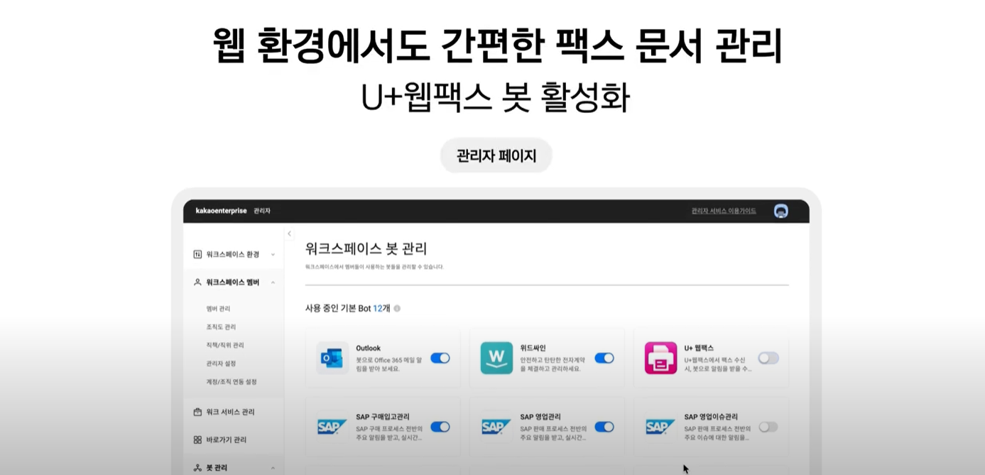 👇아래 화면에서 "U+웹팩스 봇"을 찾아서 활성화를 실행해주세요~